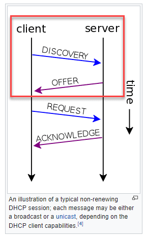 - ในการทำงานของ DHCP นั้น ไม่ใช่อยู่ดีๆ DHCP Server จ่าย IP ออกไปเฉยๆ แต่จะมีการสื่อสารกันทั้งส่งข้อความไป และตอบกลับเป็นขั้นตอนตามภาพประกอบ ซึ่งจากภาพจะเห็นว่าหลังจาก Mikrotik ทำงานจนถึงขั้นตอน offer แล้ว เครื่องลูกไม่ตอบกลับ ทำให้ขั้นตอนทำงานถึงแค่ที่ตีกรอบสีแดงไว้ แต่ไม่ครบถ้วนทั้งหมด ตัว Mikrotik จึงใส่ Log ไว้ให้เราทราบเป็นข้อมูล